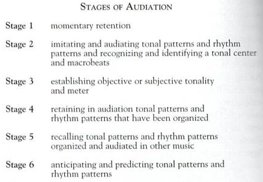 Back in the summer of 1994, when I wrote my book The Ways Children Learn Music, I included a short chapter on audiation. Back then, I didn’t want the reader to get bogged down with too much detail about the stages and types. My goal was to explain, early in the book, what audiation is and what it’s not. (It’s not inner hearing. It’s not aural imagery. It’s not aural memorization. And so on.) I was then free to use the word audiation throughout the rest of the book because I knew that the reader knew basically what it meant.