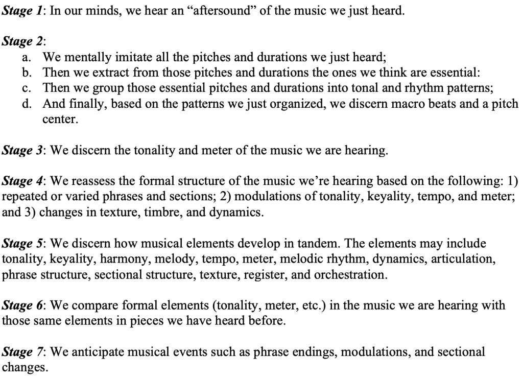 Finally, why is it so important to look at these stages, to take them apart and reassemble them? Because they’re too important to gloss over, as I think many music teachers do, when they get bogged down with the pressure of teaching. These stages are about how music students learn to understand music; and by extension, they guide us in how we think and teach.